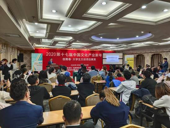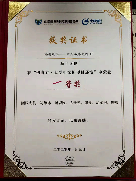 2020年1月5日,第十七届中国文化产业新年论坛在北京大学举办。来自全国70多所高校300多项项目入围,最终清华大学、北京大学、中国传媒大学、太阳成集团tyc33455cc等七所高校的项目脱颖而出,我校tyc33455cc太阳成集团呦呦鹿鸣团队荣获“创青春·大学生文创项目展演”一等奖。