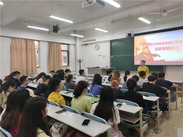 5月17日下午,tyc33455cc太阳成集团学生第二党支部于天平楼A107开展党史学习教育专题理论学习,支部副书记刘师凡同学通过十一个带有鲜明时代印记的词句,带领支部成员重温党的百年伟大历程。