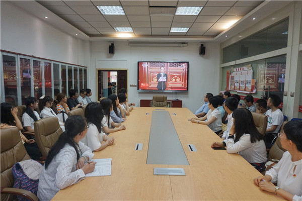 在学院创新创业活动中心,大一大四年级党支部书记组织学生党员共同收看大会直播。