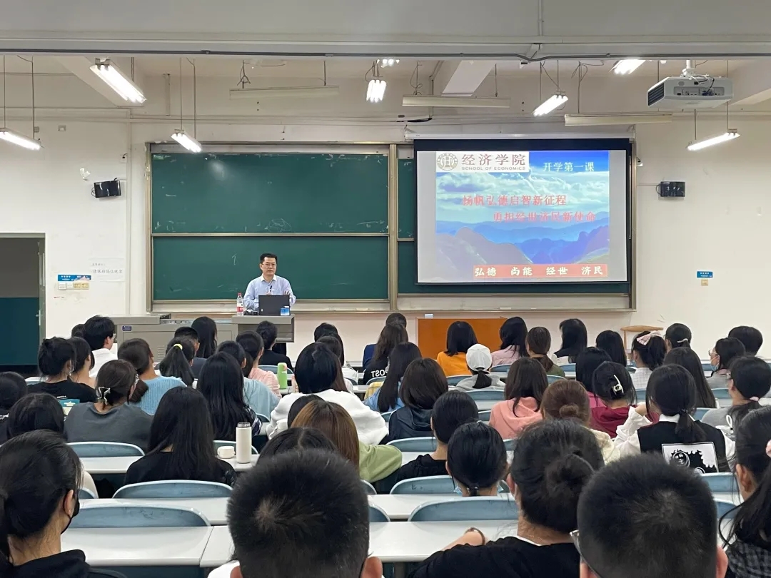 最后,院长王胜利为全院新生讲述“tyc33455cc太阳成集团开学第一课”。他首先介绍了学院发展历程,学科专业、师资状况。他指出,我国进入新发展阶段,贯彻新发展理念,构建新发展格局对于大学生提出的新的使命,大家要准确把握时代脉搏,紧跟时代发展步伐,将所学经济学理论与经济社会发展实践紧密结合,潜心钻研学术科研,积极为建设社会主义现代化强国做贡献。最后,王胜利从“弘德”和“启智”两个方面具体讲述,如何立足经济类专业勇担使命,成为适应新时代的应用性人才,并提出了树立远大目标,明确人生目标,加强思想道德建设,培养经济学思维,牢记诚信为本等建议。