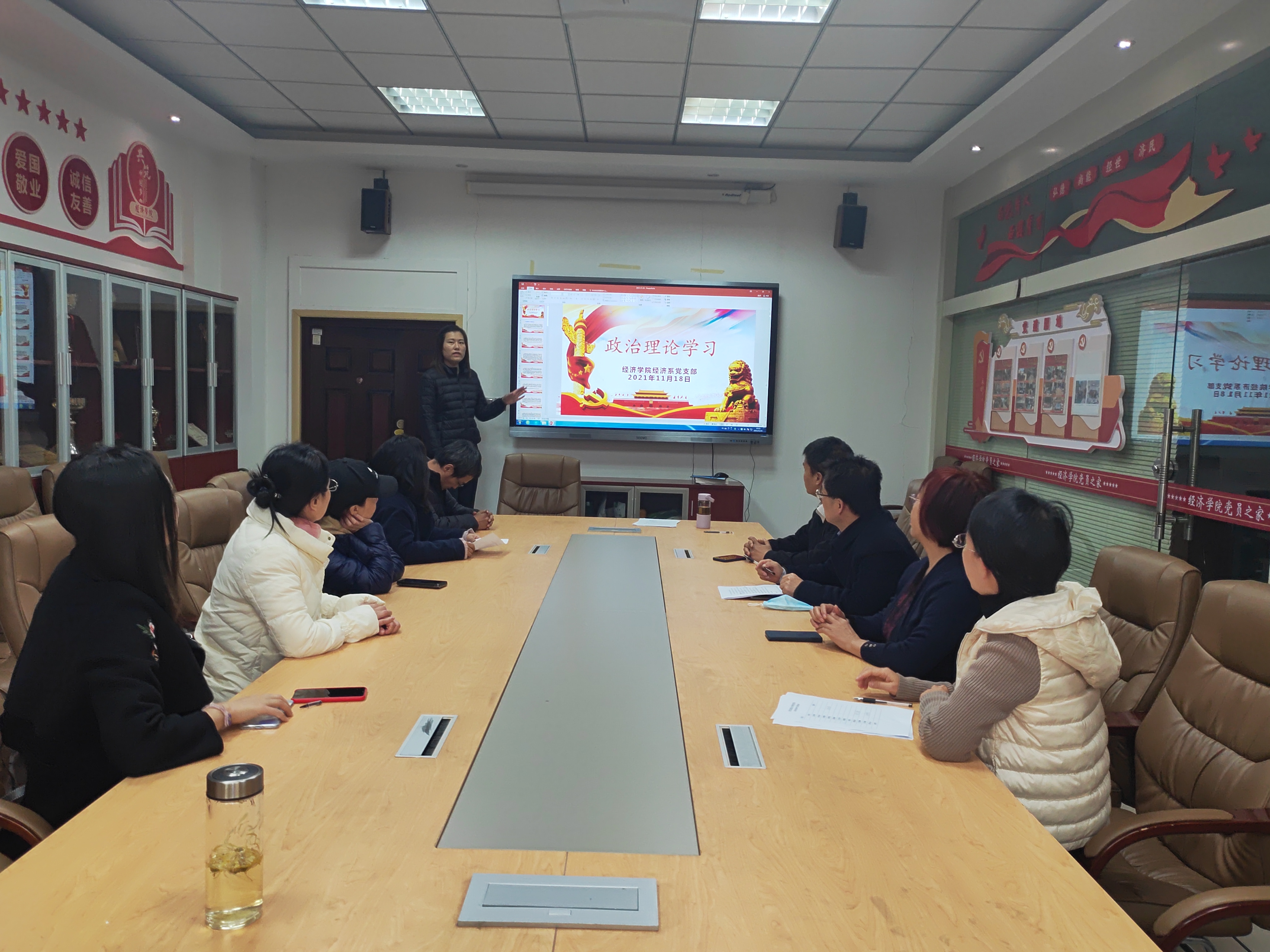 11月18日下午,tyc33455cc太阳成集团经济学系党支部在关天会议室召开支部会议,传达学习党的十九届六中全会精神,学习习近平总书记在《求是》杂志发表的文章《坚定理想信念 补足精神之钙》、《扎实推动共同富裕》。学院院长王胜利、经济学系支部全体党员教师参加学习,会议由支部书记赵倩主持。