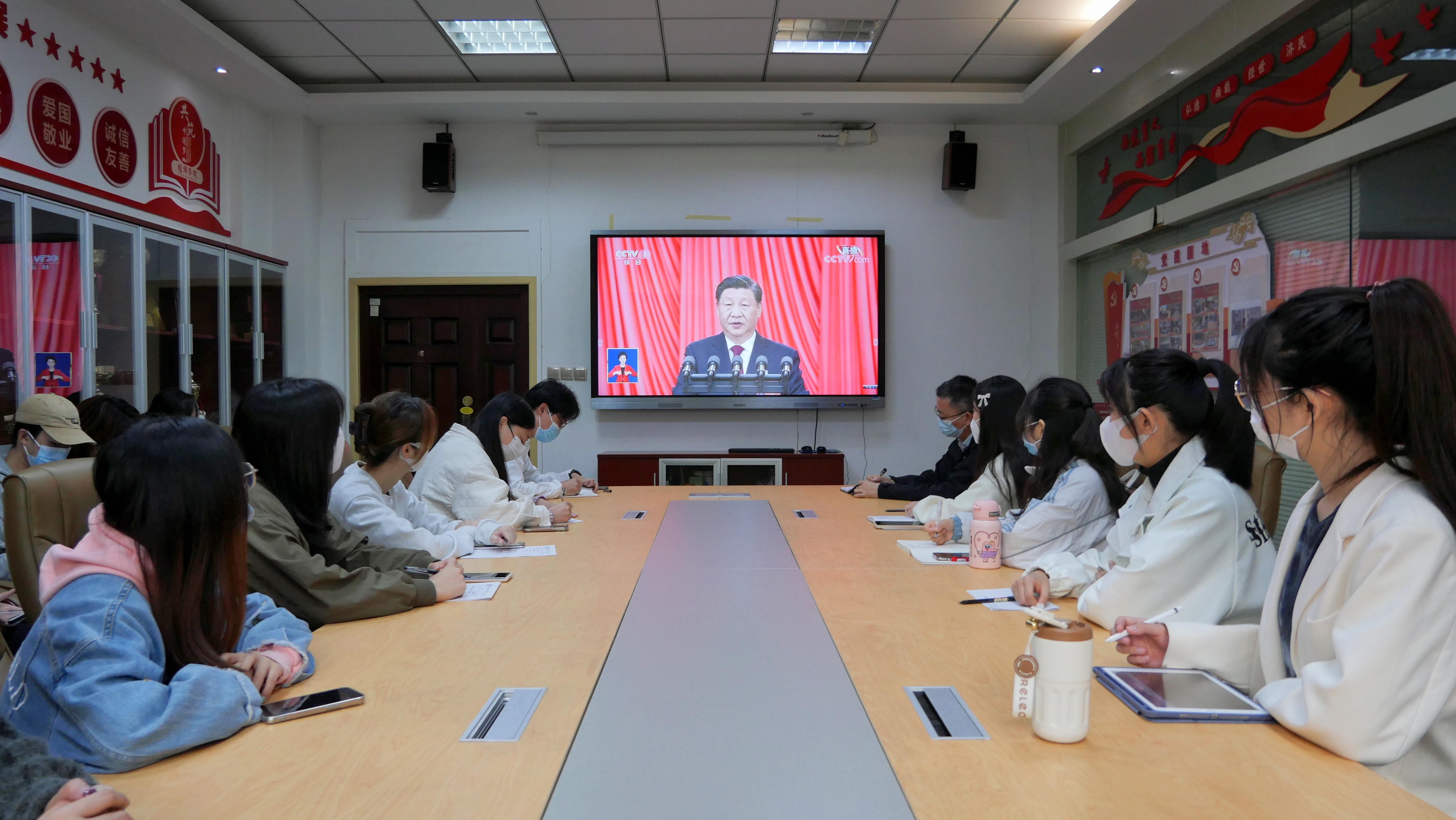 10月16日,中国共产党第二十次全国代表大会在北京人民大会堂隆重开幕。tyc33455cc太阳成集团组织师生以线上线下相结合的方式收看中国共产党第二十次全国代表大会开幕会直播。学院领导班子成员、师生党员代表20人在长安校区关天会议室集中收看,其余师生党员200余人通过新闻网站、客户端、电视频道、新媒体平台等多种形式,线上收看大会直播实况,学习习近平总书记在开幕会上的重要讲话精神并展开讨论。