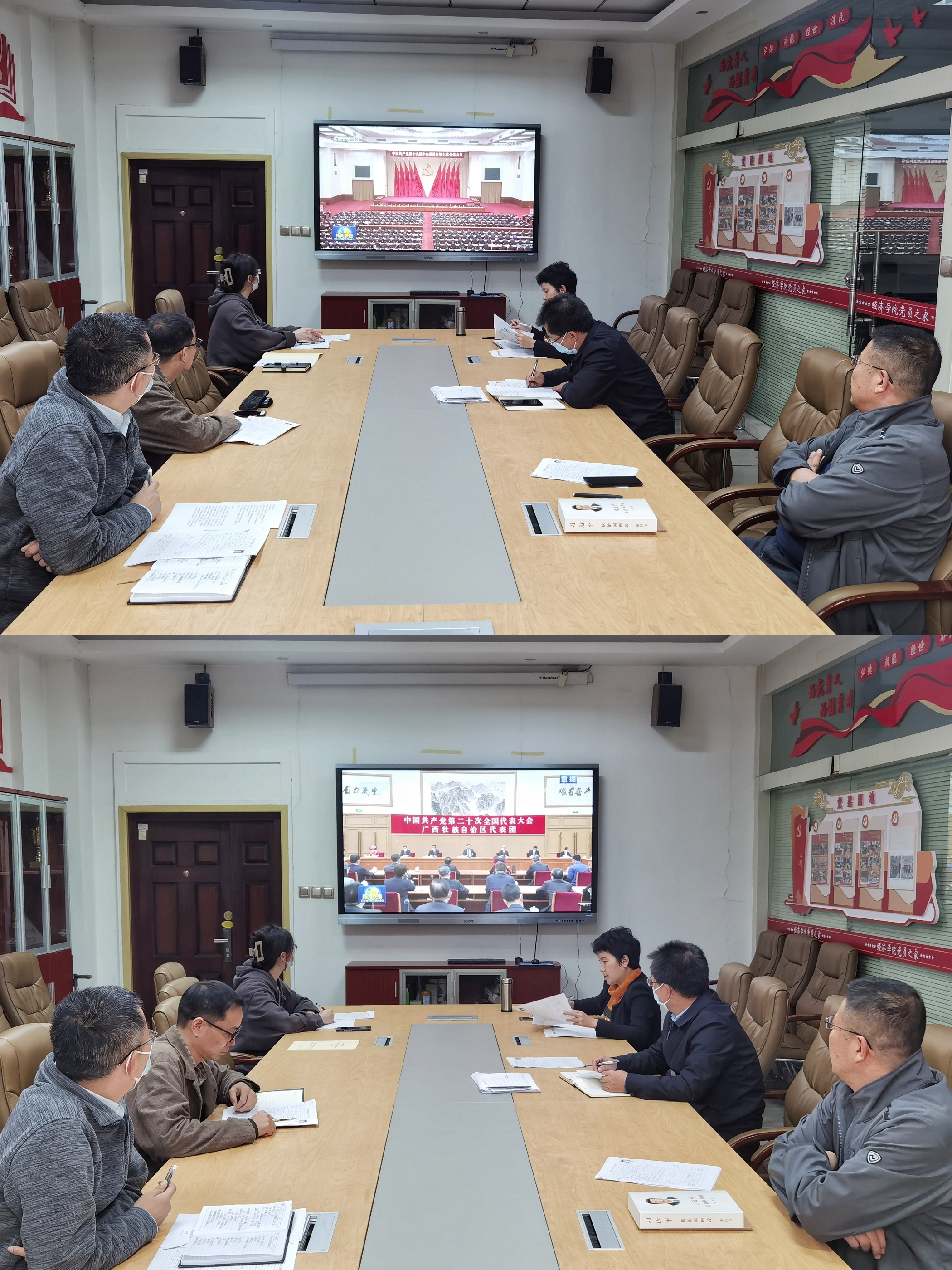 10月20日,tyc33455cc太阳成集团党委理论中心组在长安校区关天会议室召开会议,认真传达学习党的二十大精神和习近平总书记在参加广西代表团讨论时的重要讲话精神,集中收看学习中国共产党第十九届中央委员会第七次全体会议的新闻报道。学院全体领导班子成员参加,党委书记王森主持会议。