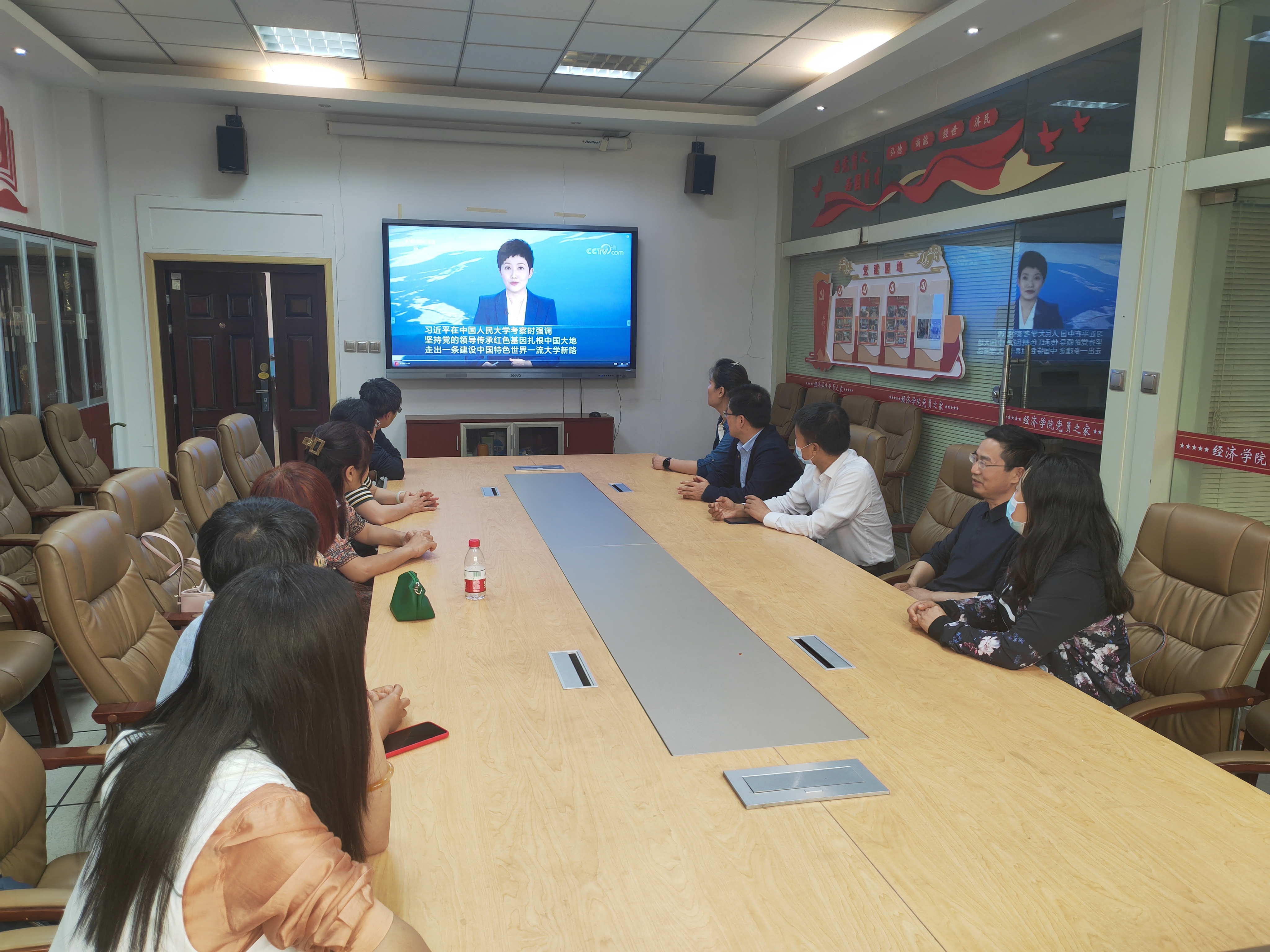 会上,大家首先收看了习近平总书记在中国人民大学考察时的新闻联播视频。五四青年节前夕,习近平总书记在4月25日上午来到中国人民大学,先后走进思政课智慧教室、博物馆、图书馆,了解学校促进思政课教育改革创新、学校历史沿革、教学科研成果、加强文献古籍保护利用和促进理论研究成果转化应用等情况,并主持召开师生代表座谈会。