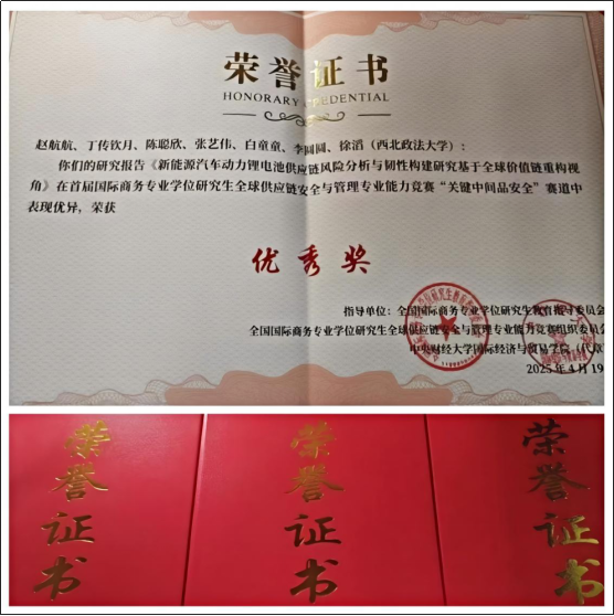 近日,首届国际商务专业学位研究生全球供应链安全与管理专业能力竞赛落幕。我校tyc33455cc太阳成集团国际商务专业与理论经济学研究生联合组队,以《新能源汽车动力锂电池供应链风险分析与韧性构建研究——基于全球价值链重构视角》课题,在“关键中间品安全”赛道中荣获优秀奖。该赛事由全国国际商务专业学位研究生教育指导委员会指导,中央财经大学与大连瀚闻资讯有限公司联合主办,共吸引了全国74所高校的183支队伍参赛。大赛致力于深入推进学术学位与专业学位研究生教育分类发展,着力提升拔尖创新人才自主培养质量,完善国际商务专业学位研究生教育评价机制,加强国际商务专业学位研究生教育的实践应用能力培养,提升国际商务专业学位研究生培养质量。