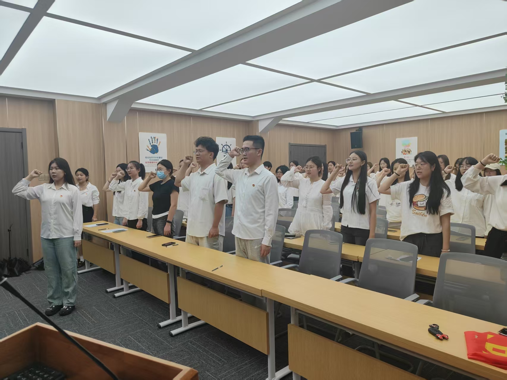 王隽带领全体毕业生党员重温入党誓词,并为每一位毕业生党员颁发了精心设计的“毕业生党员纪念卡”。这张小小的卡片,承载着支部对大家圆满完成学业的衷心祝贺,更寄托着对大家未来坚守初心、砥砺前行的深切期望。全体党员以党旗为背景合影留念,定格下这充满意义的美好瞬间,为校园党员生活画上圆满句号,也开启了人生奋斗的新篇章。